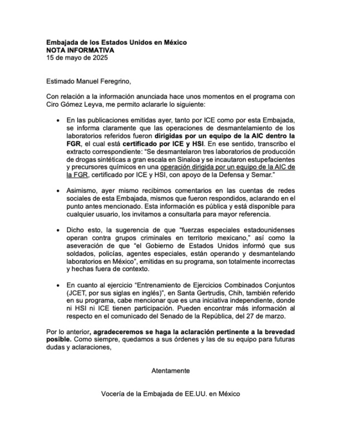 A través de un comunicado dirigido al noticiario de Ciro Gómez Leyva, en Radio Fórmula, la Embajada de Estados Unidos en México aclara que los operaciones de desmantelamiento de laboratorios clandestinos en Sinaloa, fueron dirigidos por un equipo de la AIC (Agencia de Investigación Criminal) de la Fiscalía General de la República, lo cual está certificado por ICE y HSI (Departamento de Seguridad Nacional de EE.UU.)