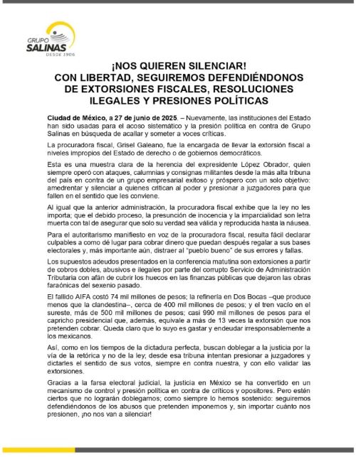 En el Salón Tesorería, de Palacio Nacional, la procuradora fiscal, Grisel Galeano García, dio cuenta este día del modus operandi de Grupo Salinas S.A. de C.V., de Ricardo Salinas Pliego, para esquivar el pago de impuestos mediante el alargamiento de litigios, recursos de amparo, impugnación de jueces y hasta recusación de ministros para asegurar fallos favorables en la Suprema Corte de Justicia de la Nación, y que hasta ahora suman un acumulado de 74 mil millones de pesos.