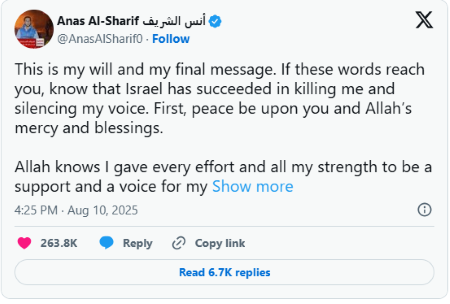 Tropas israelíes asesinaron este domingo 10 de agosto a seis periodistas palestinos, cinco de ellos trabajaban para la cadena de noticias catarí Al Jazeera, incluyendo al corresponsal de 28 años, Anas al-Sharif, a quien falsamente el gobierno de israelí lo acusaba de liderar una célula del grupo islámico Hamás