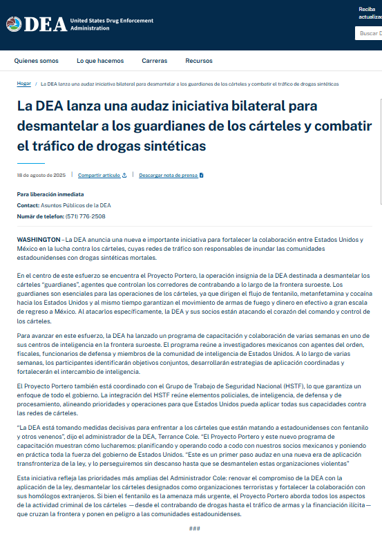 Ninguna de las instituciones de seguridad del Gobierno de México ha acordado programa alguno con la DEA; “lo único que hay es un grupo de policías de la Secretaría de Seguridad y Protección Ciudadana que estaban llevando un taller en Texas, es todo lo que hay, no hay nada más. No sabemos por qué emitieron este comunicado”, precisa la presidenta Claudia Sheinbaum Pardo