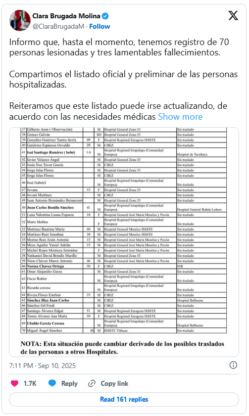 Hacia las 7:00 horas de la noche, la jefa de Gobierno de la Ciudad de México, Clara Brugada Molina, en conferencia de prensa en el lugar, informó que hasta ese momento se tenían registradas tres personas muertas y 70 lesionadas (51 hombres, 16 mujeres) y dos más en calidad de desconocidos, que fueron trasladadas a distintos hospitales.